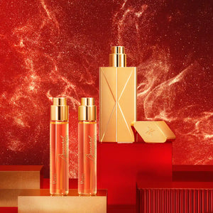 Der ikonische Duft erhältlich in fünf 11 ml Atomizers, begleitet Sie im eleganten Globe Trotter Travel Spray in der luxuriösen Gold-Edition, wo auch immer Ihre Reise hingeht.