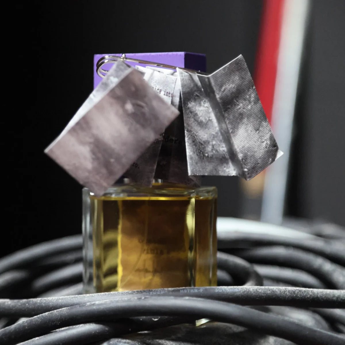 Der monolithische Flakon spiegelt die Textur der zerrissenen Leinwand wider. Das Gemälde wird zur Oberfläche. Lila wird zur Haut. Das Meer kann eingeatmet werden. Die Botschaft, die an der Sicherheitsnadel befestigt ist, ist in den Verschluss eingraviert, der wie eine lebende Reliquie ruht. Dies evoziert Instabilität und vorübergehende Schließung; eine Wunde, die mit provisorischen Mitteln und zweideutigem Schutz zusammengehalten wird. Alles ist prekär, doppelt und schlecht genäht. Die Dinge scheinen still zu sein, aber sie zittern vor Tränen. Die Welten scheinen vereint, doch ein bloßer flüchtiger Blick offenbart den Abgrund des Schmerzes, als wäre die menschliche Psyche ein zerrissenes Kleid, das durch eine eilige Geste zusammengehalten wird.