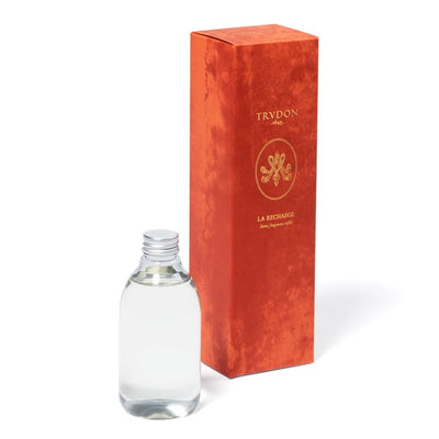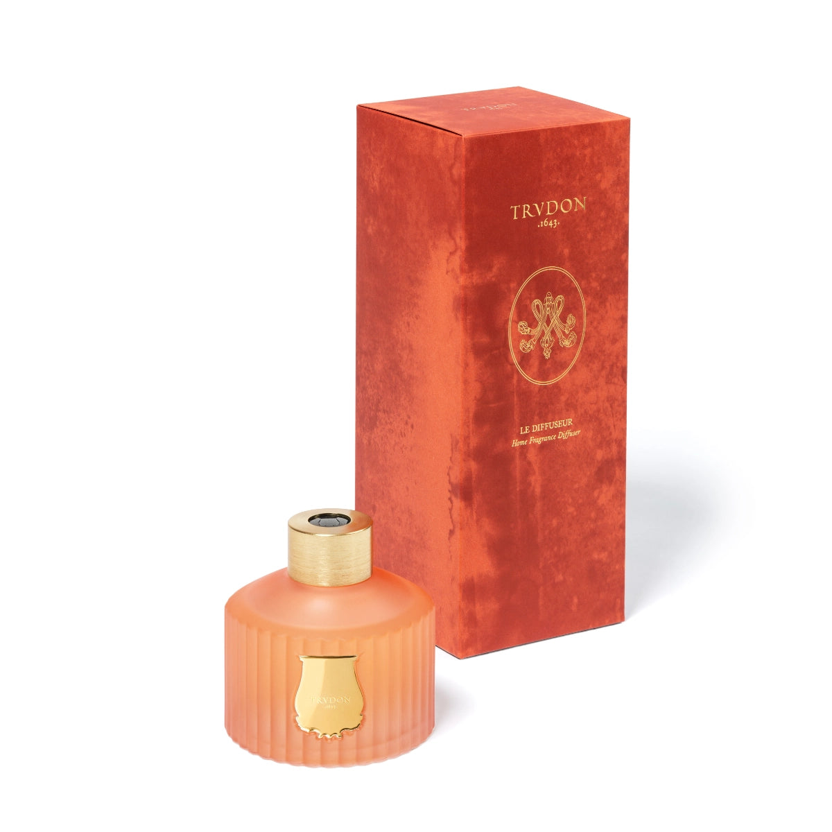 Der Diffusor wird in derselben Glasmanufaktur wie die Kerzen handgefertigt und ist mit einem zu 100 % recycelbaren Aluminiumring versehen. Durch diesen Ring werden 8 natürliche, schwarze Rattanstäbchen gesteckt. Es handelt sich um einen 350 ml fassenden, geriffelten Behälter, der mit einem goldenen Emblem verziert ist.