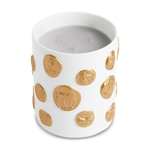 Die Opulenz des antiken Griechenlands trifft auf moderne Raffinesse. Jede Kerze, die in zwei Größen erhältlich ist, ist ein handgefertigtes Meisterwerk aus weißem Biskuitporzellan, das mit 24-karätigen Goldmünzen verziert ist, die an das reiche historische Erbe und die Handwerkskunst erinnern. Der von Meisterparfümeur Yann Vasnier kreierte Duft enthält eine exquisite Mischung aus Kardamom, Koriander, schwarzem Pfeffer, Muskatnuss, Safran, Zedernholz und Leder. Erhältlich mit 1 Docht (400 g) und 3 Dochten (1,25 kg).