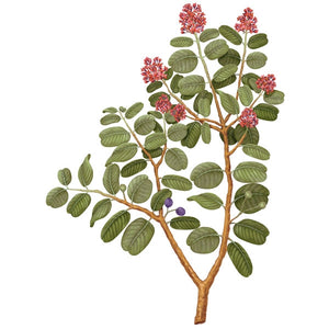 Sandelholz ist ein duftender Baum mit robusten Blättern, der im indischen Bundesstaat Mysore wächst. Sein Holz wurde häufig für den Bau von Tempeln verwendet, die bis heute seinen durchdringenden Duft bewahrt haben. Sandelholzöl wird seit über 4000 Jahren als Heilmittel verwendet und ist ein gängiges Fixiermittel in der Parfümerie. Es ist Bestandteil hinduistischer und buddhistischer Rituale, wobei erstere oft den Bindi-Punkt aus seiner Paste herstellen und letztere es zu Weihrauch verarbeiten.