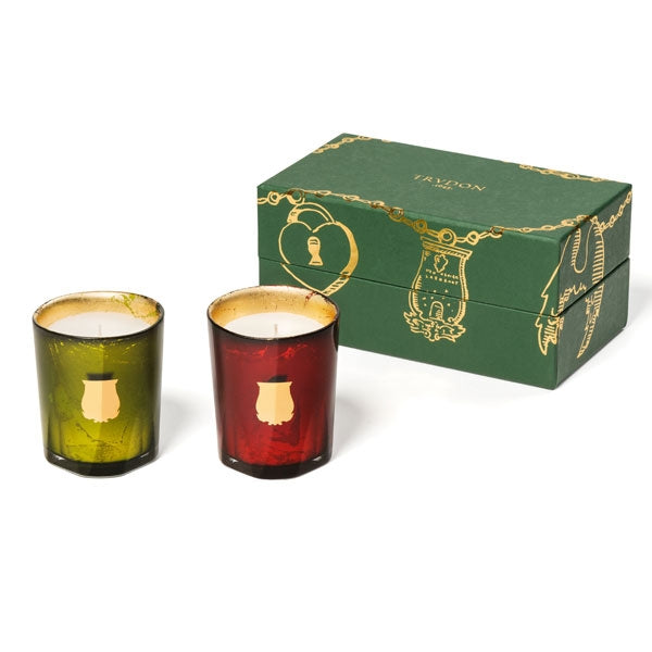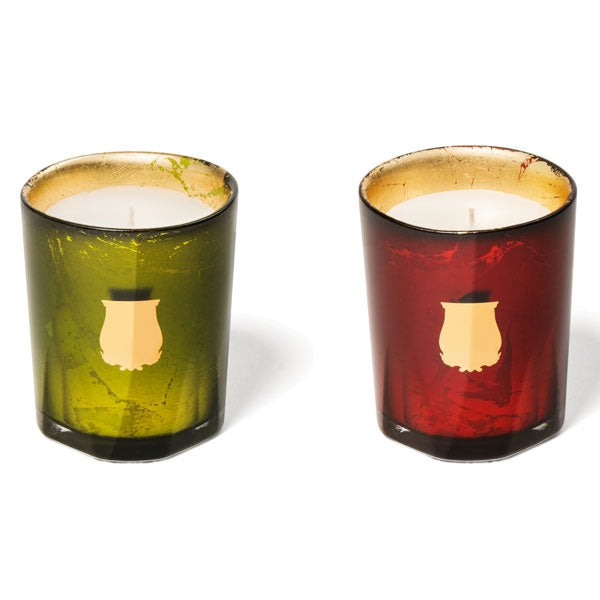 Die zwei kleinen Kerzen Gloria und Gabriel mit je 70 g präsentieren sich in einer tannengrünen Schachtel, verziert mit vergoldeten Charms, um das Weihnachtsfest zu zelebrieren: In ihren festlich wirkenden rot und grün lackierten Gläsern, welche mit Blattgold verziert sind, sorgen sie diskret und doch wirkungsvoll für eine feierliche Atmosphäre.