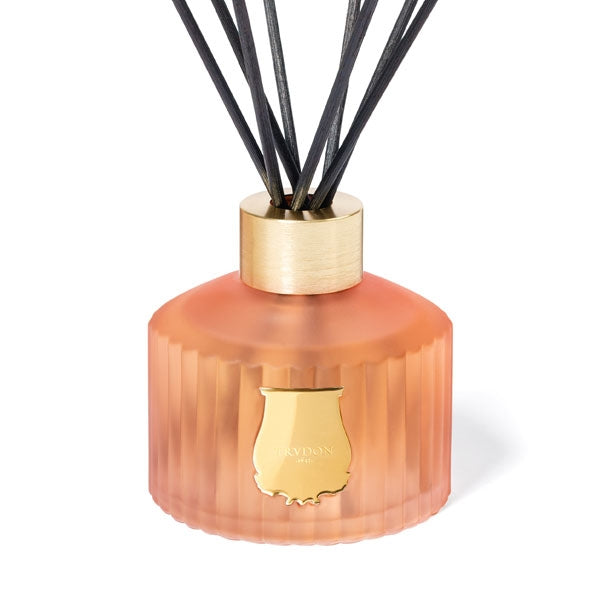 Der Diffusor wird in derselben Glasmanufaktur wie die Kerzen handgefertigt und ist mit einem zu 100 % recycelbaren Aluminiumring versehen. Durch diesen Ring werden 8 natürliche, schwarze Rattanstäbchen gesteckt. Es handelt sich um einen 350 ml fassenden, geriffelten Behälter, der mit einem goldenen Emblem verziert ist.