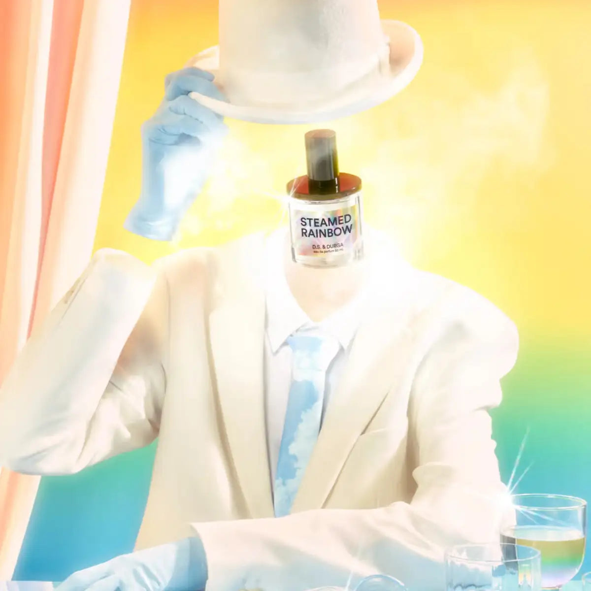 „Ich wollte schon lange einen Duft kreieren, der wie ein Regenbogen riecht (besonders inspiriert von Terry Rileys A Rainbow In Curved Air). Das Konzept besteht darin, Materialien in jeder Farbe des Regenbogens in einem bestimmten Verhältnis zu verwenden, die von der feuchten Luft ihrer Umgebung weich gemacht werden. Ab sofort können Sie Regenbögen tragen. Warten Sie, bis Sie riechen, wie zart sie sind.“ – D.S.