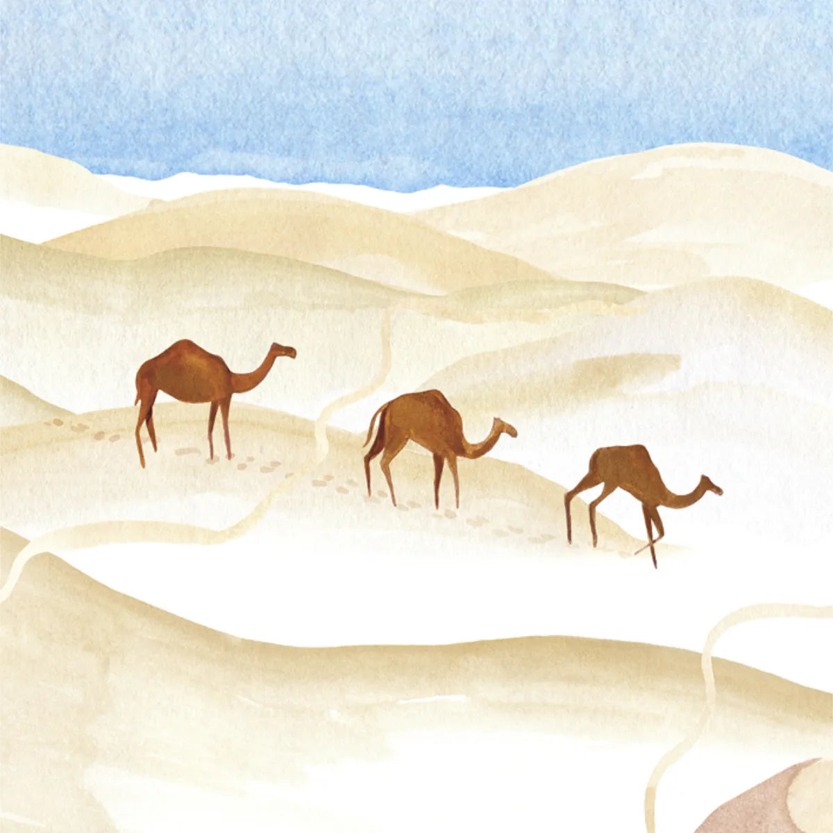 Unsere Karawane zieht schweigend weiter. Wir bewegen uns im Rhythmus der Kamele, in einer fast hypnotischen Pendelbewegung. Der Sattel unserer Gastgeber, erhitzt von der stolzen Sonne, verströmt den süßen und zarten Duft von Leder. Wir nähern uns Al Khaluf. Fast eine Mondlandschaft. Die Farbe des Sandes hat sich in ein blendendes Weiß verwandelt. Auf diesen Zuckerdünen werden wir winzig klein.