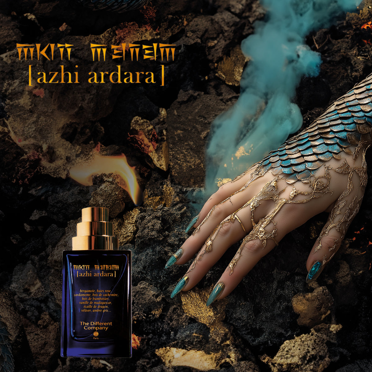 I am born from Azhi Ardara, the dragon in Mount Abgalion where time seemed to pause in ancient stone, the dragon who became a woman of unmatched beauty to seduce all creatures of mankind. I am the bewitching elixir of perfect seduction, a luminous adventure of bittersweet sensuality, combining a unique blend of cashmere and sandalwood, vanilla, raspberry and dragon scale. I am a promise of eternal attraction. I am Azhi Ardara.