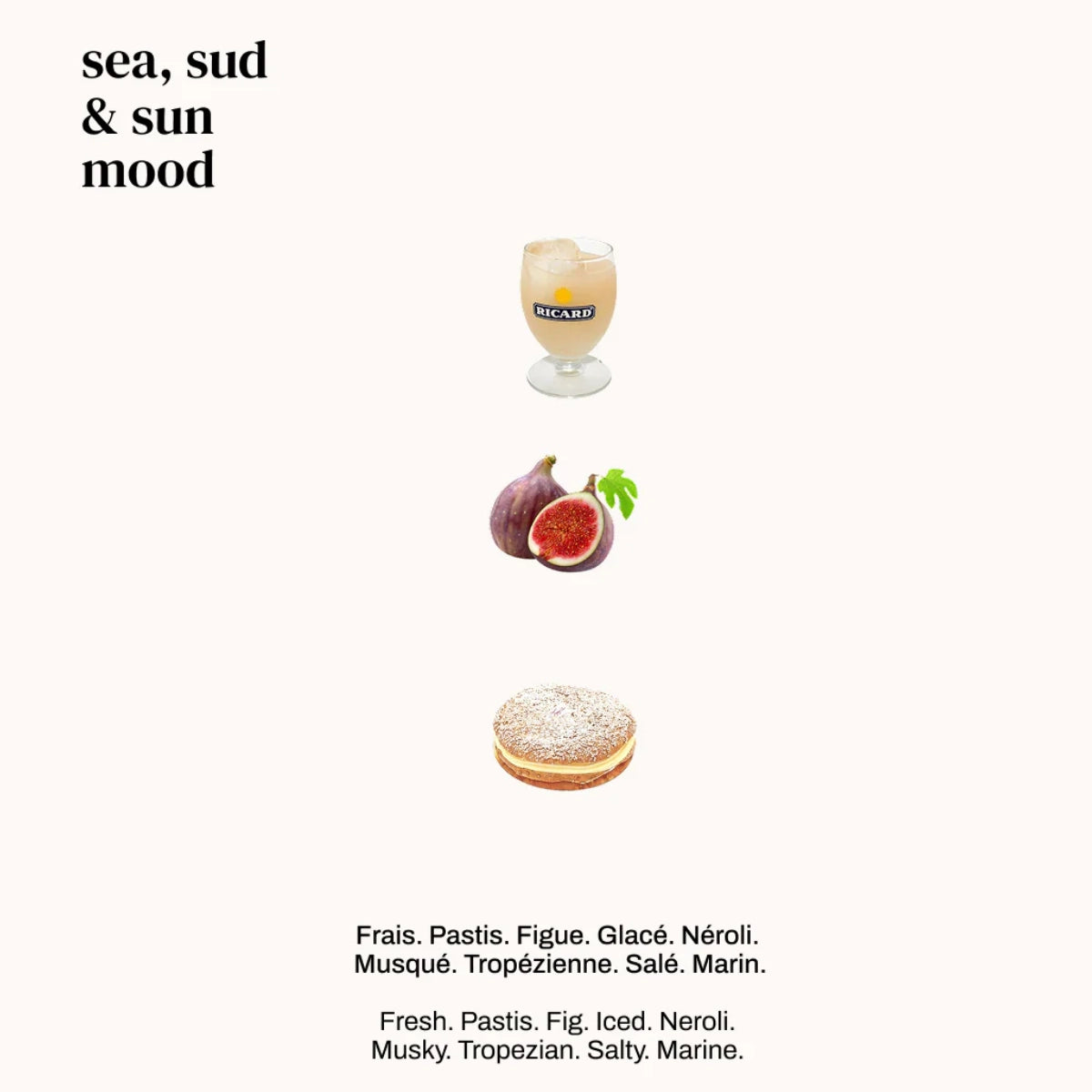 Aperitif, fresh. Pastis. Fig. Iced. Neroli. Musk. Tropézienne. Salty. Maritime.