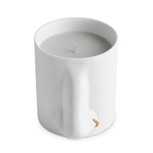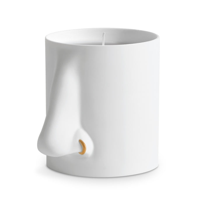 The Nez Candle is a delicate porcelain vessel depicting a monumental nose (nez) with a golden nose piercing. The vessel is made of fine porcelain and 24k gold and contains paraffin wax with a single wick.