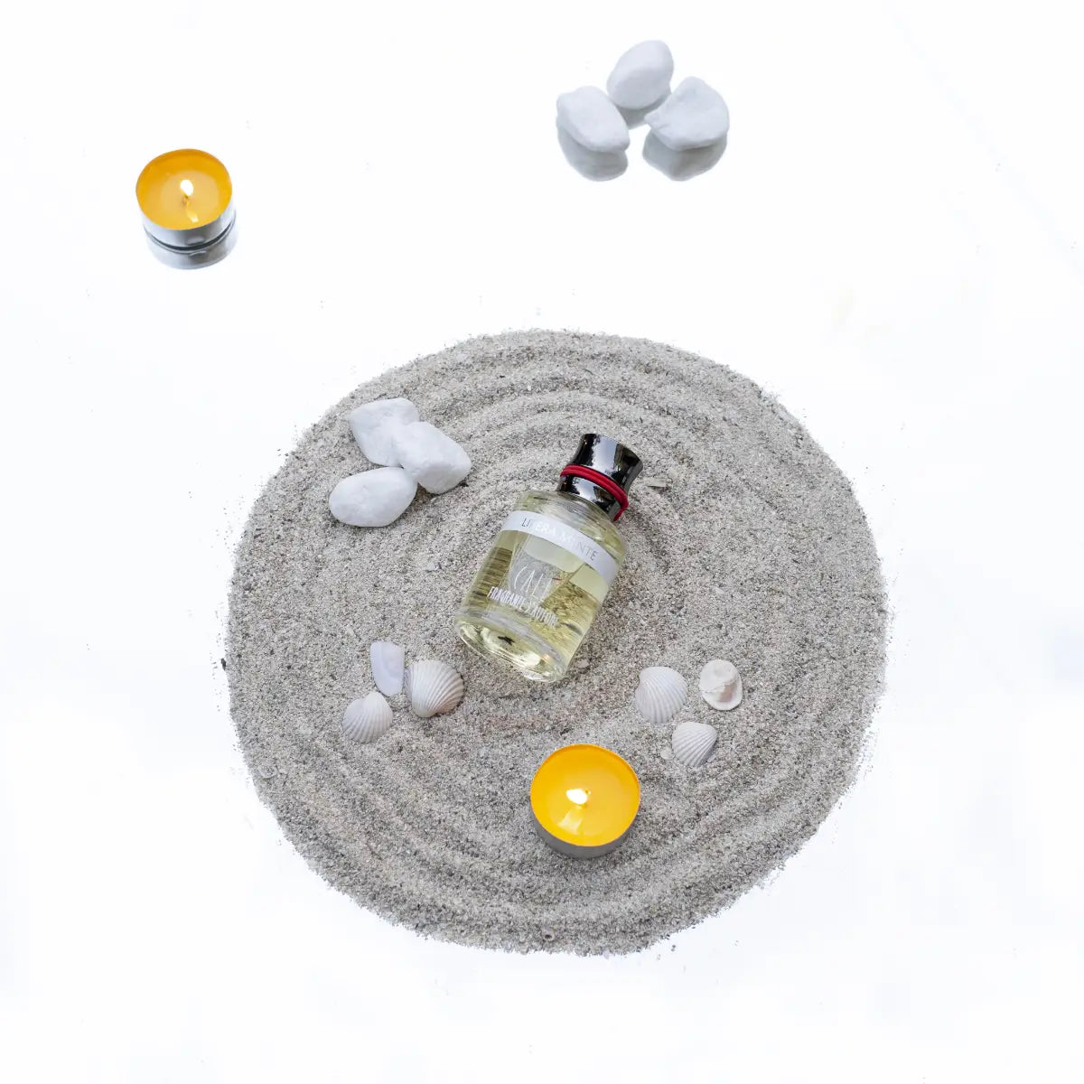 We enter a garden, a peaceful oasis hidden in between skyscrapers. The absence of water and the evoking of its pouring are represented in olfactory terms by Blue-Green Algae (it gives a salted feature to the fragrance with sand scents), obtained through molecular distillation. The apparently contrasting top notes of Rhubarb, Ginger, Bitter Orange and marine hints structure themselves in an unusual harmony. The heart notes slowly slide into a delicate bouquet where Magnolia and Cyclamen combine themselves with a Fir nuance. Vetiver and Black Tea complete the Libera Mente’s olfactory meditation creating a compact and soft one that invites us to pay attention to what really matters.