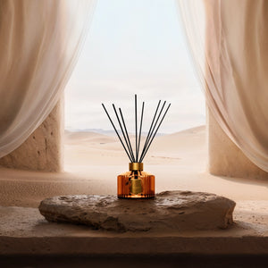 True to Trudon’s craftsmanship, the Altaïr collection evokes the warmth of the desert: the amber-colored glass shines with warm reflections. Hand-crafted in Italy, the candle glass is all the more luminous with the golden Trudon emblem. Elegantly fluted on the outside, the diffu ser echoes the architectural striations of the dunes, further highlighted by a golden fret and emblem.