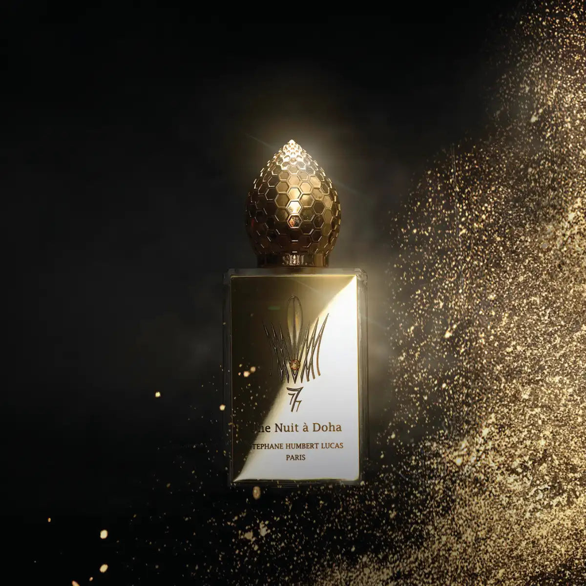 Une Nuit à Doha is presented in a transparent flacon with genuine gold lettering, gold cap and a small-faceted clear Swarovski crystal set on the stylized crown.