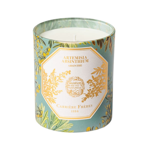 Coloured illustrations of 19th-century botanical plates appear through the matt, grey-tinted glass. In the centre of the octagonal label is a collection of absinthe flowers in gold embossing.