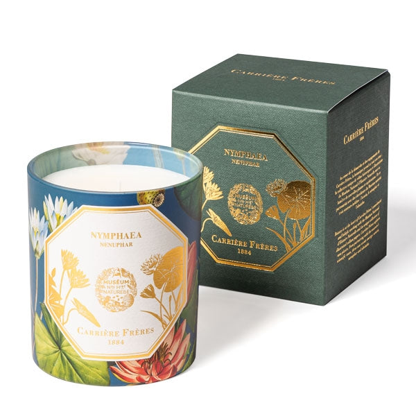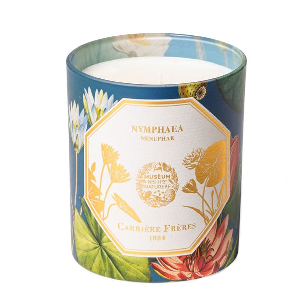 Colourful illustrations from 19th-century botanical plates appear through a matt, delicate blue glass. In the centre of the octagonal label are water lily flowers and leaves in gold embossing.