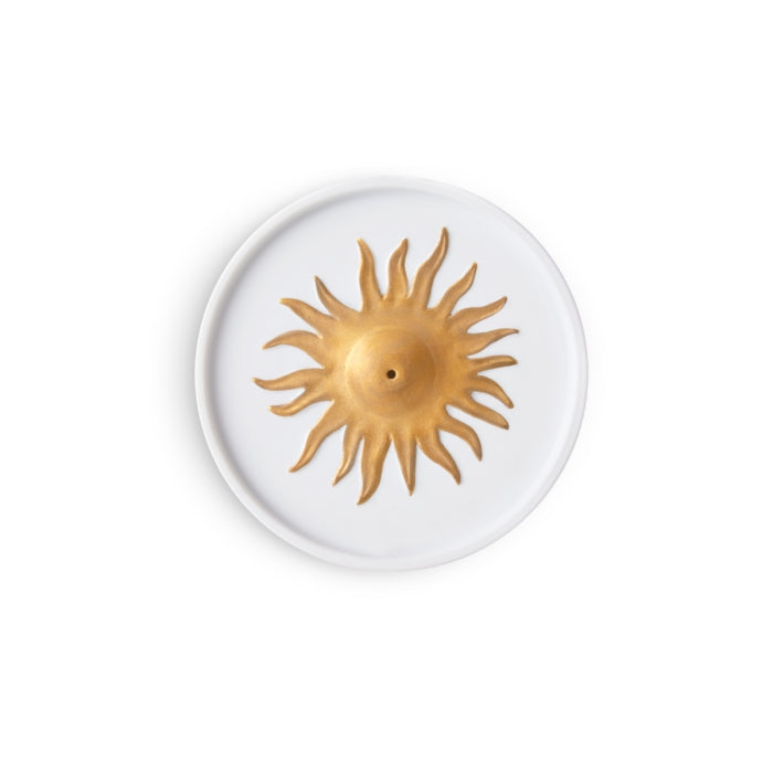 A delicate porcelain incense holder with a moulded sun (Soleil). Hand-painted with 24-carat gold. Made in Portugal.