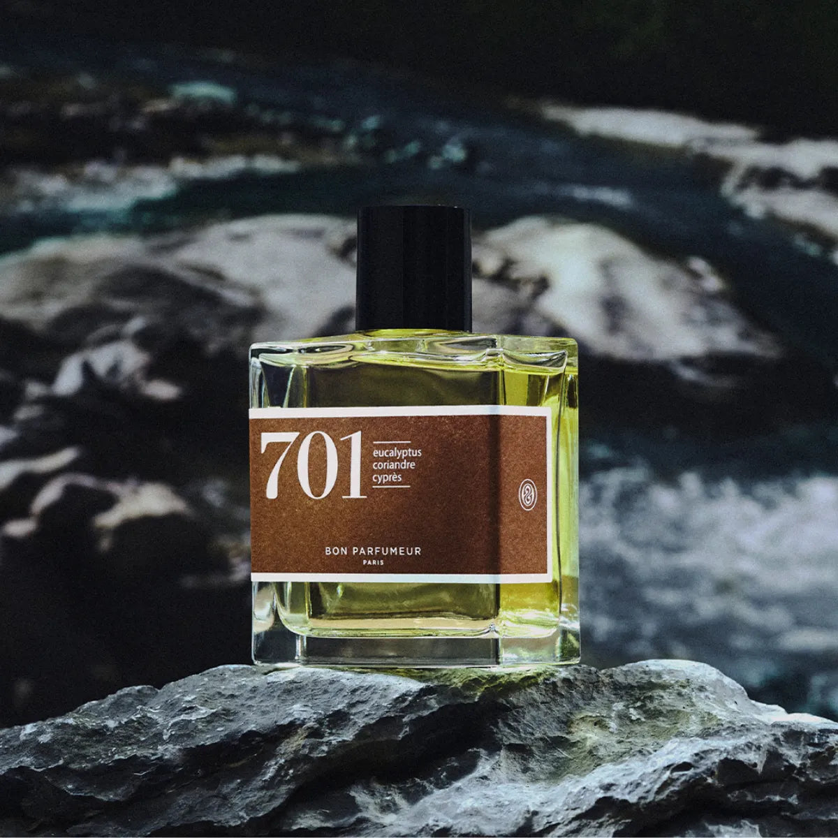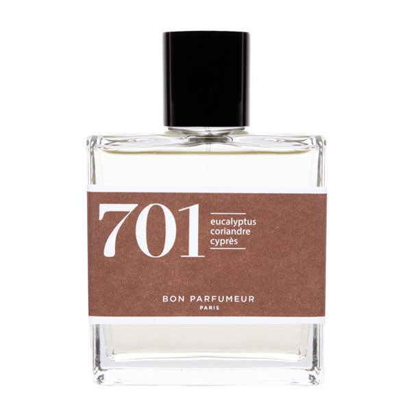 If you like to surprise, try this fragrance! It begins with substantial, slightly fruity freshness and a hint of bitterness lent by the duo of grapefruit and bergamot. 701 bursts with spices and aromatics; pepper, rosemary, coriander, eucalyptus, cypress — boom! They turn up the temperature and combine marvellously with the white wood, amber, and frankincense.