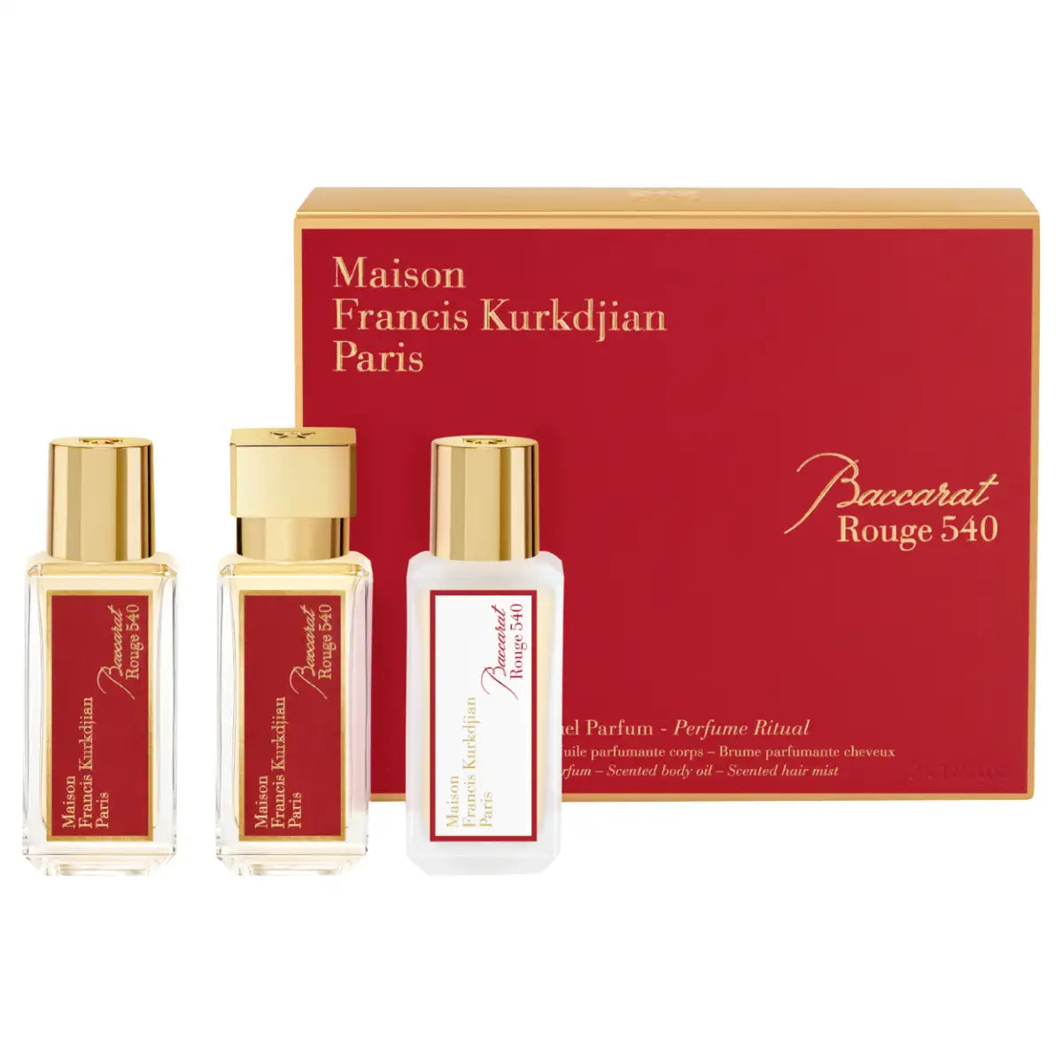Dieses perfekte Body Ritual Set enthält ein duftendes Body Oil, ein schimmerndes Body Oil und ein Hair Mist. Das Body Oil hinterlässt die Haut seidig-glatt und dezent parfümiert, während das Baccarat Rouge 540 Shimmering Oil 24-karätiges Gold zum Strahlen bringt, inspiriert von den Geheimnissen des Rouge à l’Or. Den krönenden Abschluss bildet der duftende Hair Mist, der für eine zarte und leuchtende Sillage sorgt.