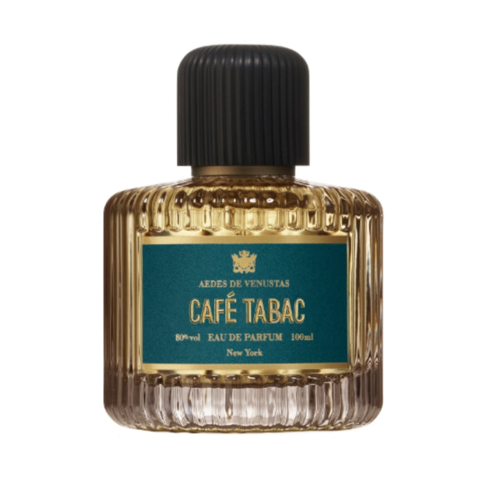 Aedes De Venustas Café Tabac is bottled in a precious flacon. A ribbed glass bottle decorated with peacock blue accents, a matte black cap bearing the insignia and a shiny yet powerful design mark the next chapter in the history of Aedes de Venustas.