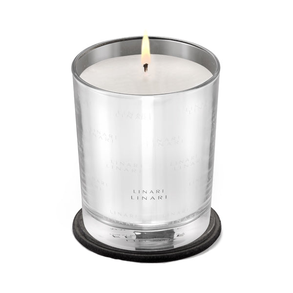 The innovatively decorated candle glass in a luxurious, purist design has been coated in two colours on the inside in a complex process. Viewed from the outside, it is high-gloss silver, which beautifully highlights the solid, transparent and light-reflecting glass base and creates a striking colour contrast. From the inside, the glass has a mystical black colour. The lid, made of solid maple wood and coated with deep black velvet, features a silver-coloured embossed LINARI logo, which can also be used decoratively as a candle and diffuser coaster.